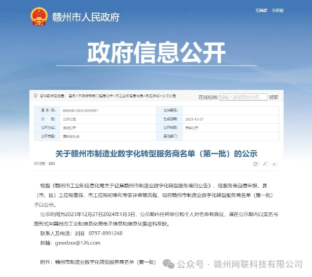 喜報!贛州網(wǎng)聯(lián)科技有限公司入選贛州市制造業(yè)數(shù)字化轉型服務商(第一批名單)!